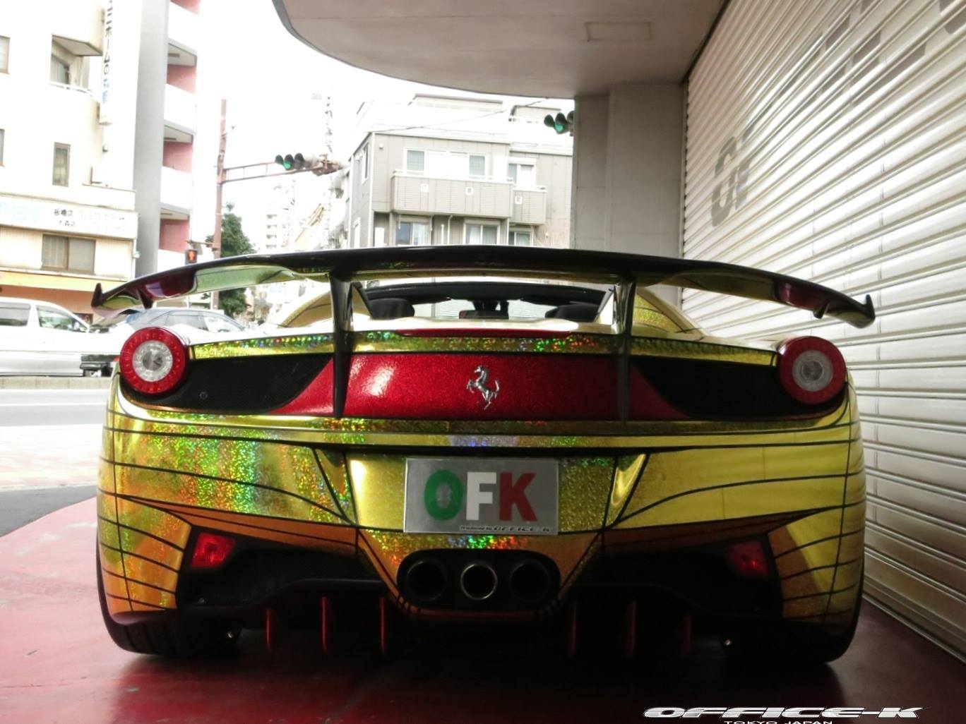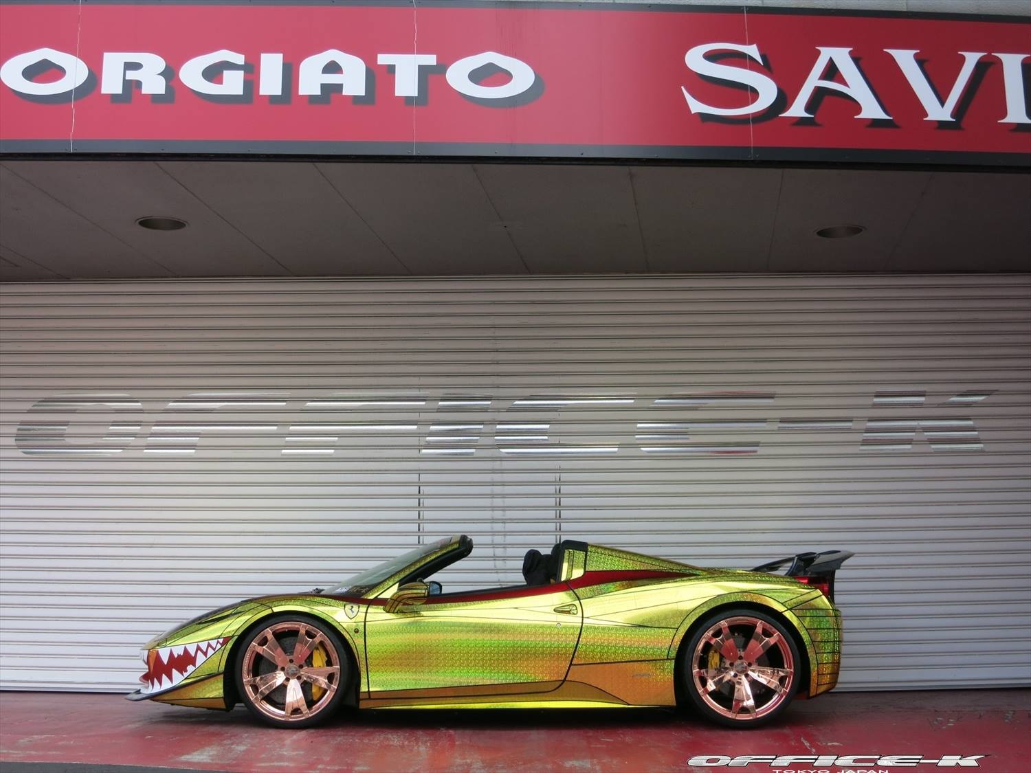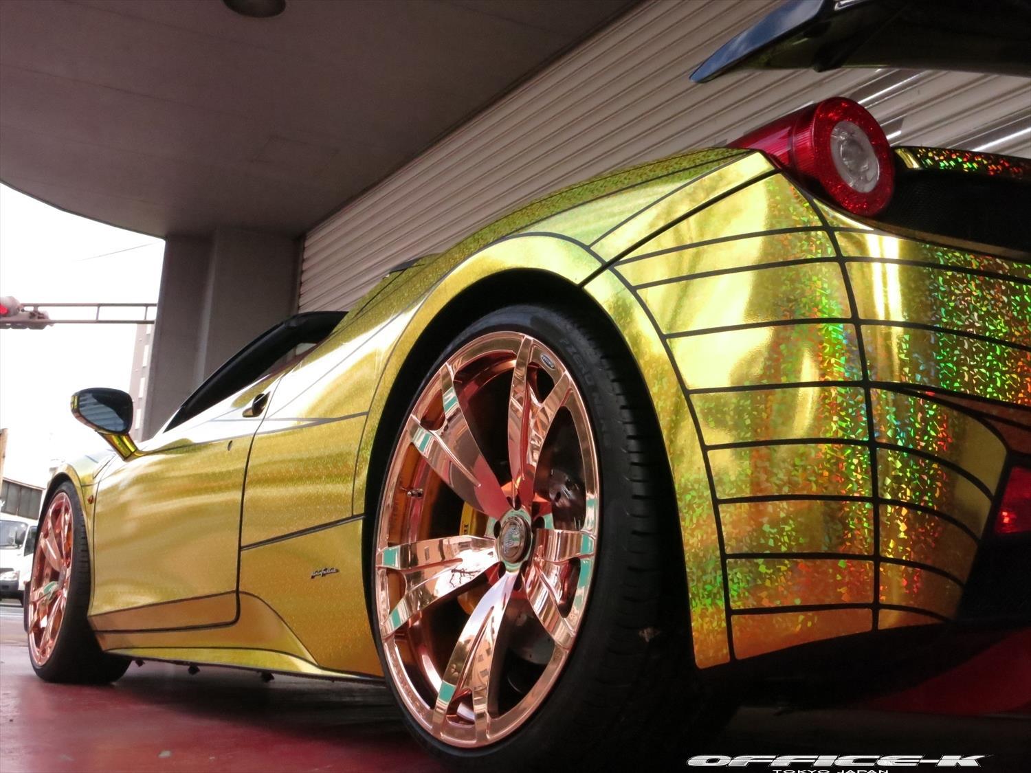 Însă asta… asta este deja la un alt nivel. Ferrariul 458 Italia Spider din imaginile de mai sus a primit un tratament hardcore: folie de culorea metalului galvanizat, peste care s-a pus o folie de auriu transparent, completat de un efect perlat.