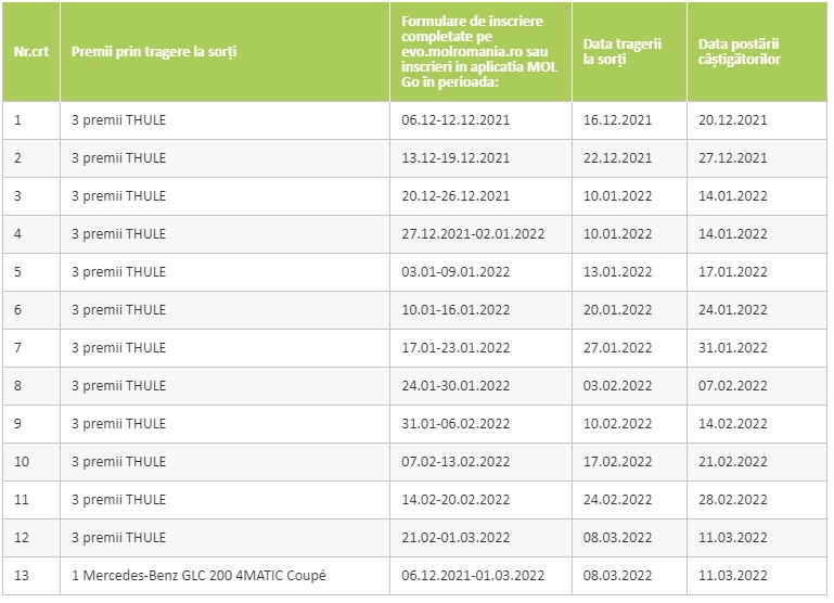 Tragerea la sorți pentru marele premiu, un SUV Mercedes-Benz GLC 200 4MATIC Coupe, va avea loc pe data de 08 martie 2022, urmând ca pe 11 martie 2022 să fie publicat numele câștigătorului.