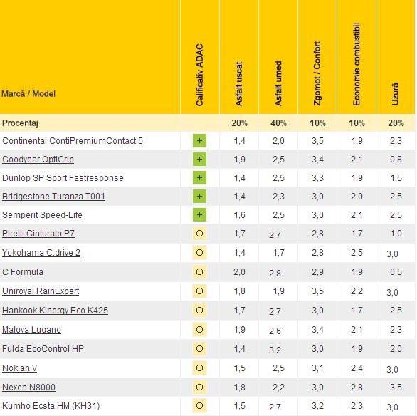Cel mai apreciat cauciuc de vară este Continental Conti Premium Contact 5, care demonstrează o mare siguranţă în utilizare. Pneul Goodyear Opti Grip se detaşează mai ales prin rezistenţa foarte mare la uzură, în timp ce Dunlop SP Sport Fast Response, pe lângă uzura scăzută, se detaşează prin comportamentul exemplar pe asfalt uscat.