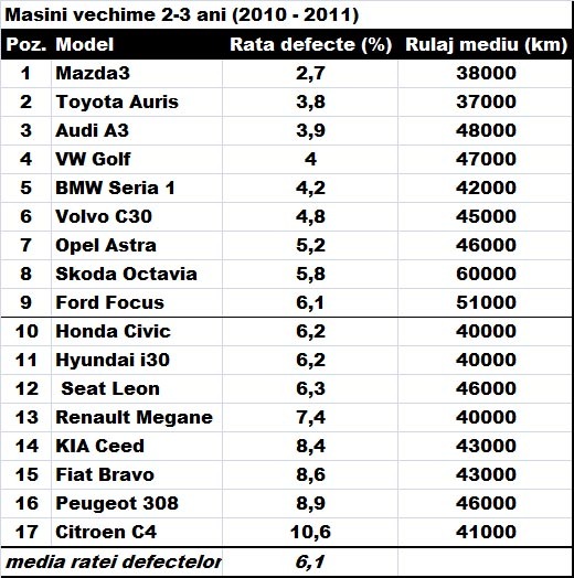 În cazul maşinilor second hand cu vechime între 2 şi 3 ani, podiumul este ocupat de Mazda3, Toyota Auris şi Audi A3, modelul Mazda având de departe cea mai mică rată a defectelor constatate cu ocazia inspecţiei tehnice periodice.