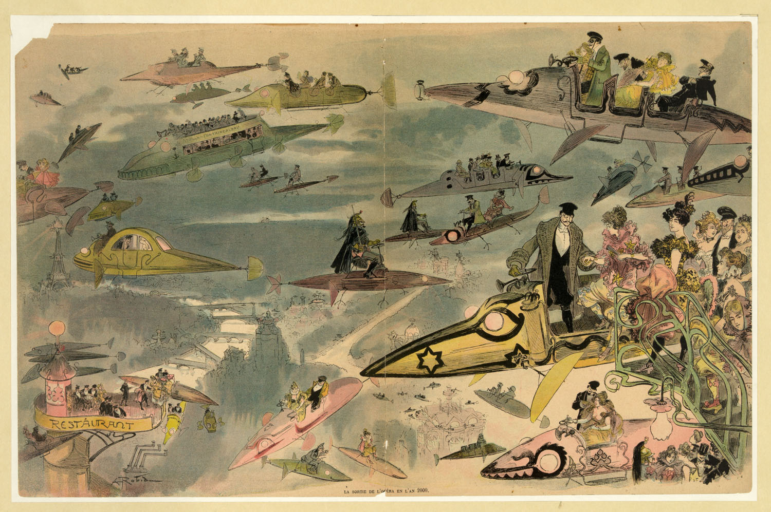 Încă de la sfârşitul anilor 1800, graficianul francez Albert Robida şi-a imaginat cum ar arăta ritualul de a merge la operă în anul 2000. Un ritual care ar fi trebuit să implice nişte vehicule zburătoare ce seamănă cu buşteni ghidaţi de crengi în loc de aripi. A, da, şi ţinuta trebuia să fie obligatoriu în stilul vestimentar al Franţei de la sfârşitul secolului al XIX-lea.