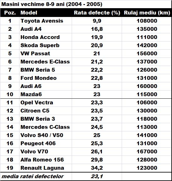 Mercedes-Benz E-Class şi BMW Seria 5 se plasează sensibil mai bine decât Audi A6, în timp ce Ford Mondeo stă mai bine decât Mazda6 şi Opel Vectra. Destul de dezamăgitoare poziţiile de după jumătatea clasamentului ale modelelor premium germane BMW Seria 3 şi Mercedes-Benz C-Class, dar şi a familiei suedeze Volvo S40/V50 – mai ales în condiţiile în care francezul Citroen C5 stă surprinzător de bine.