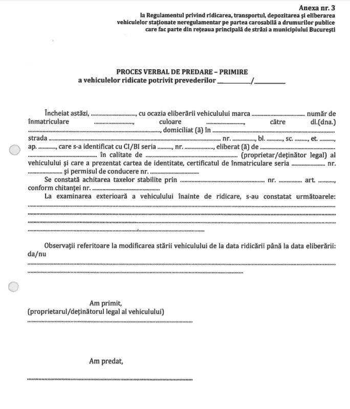 Pe site-ul Primăriei Bucureşti a fost publicat un proiect de hotărâre privind ridicarea, transportul, depozitarea si eliberarea vehiculelor stationate neregulamentar pe partea carosabila a drumurilor publice care fac parte din reteaua principala de strazi a municipiului Bucuresti.