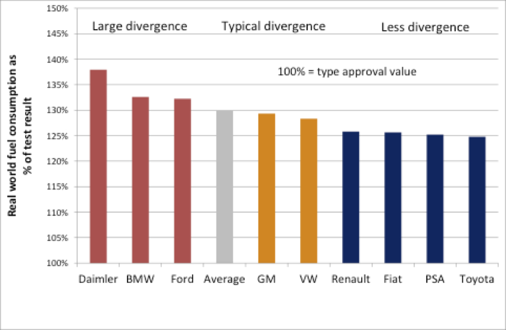 În ceea ce ţine de diferenţa (în Europa) dintre consumul real şi cel declarat, aceasta s-a mărit considerabil în 12 ani – dacă în 2001 diferenţa era de circa 8%, în 2013 s-a ajuns şi la un procent de 31% între ceea ce declară producătorii şi cât consumă, în realitate, un anumit model. Desigur, media este generalistă, cuprinzând toate modelele şi toate motorizările din gama producătorului. În cazul maşinilor de flotă, procentul ajunge şi la 43%.