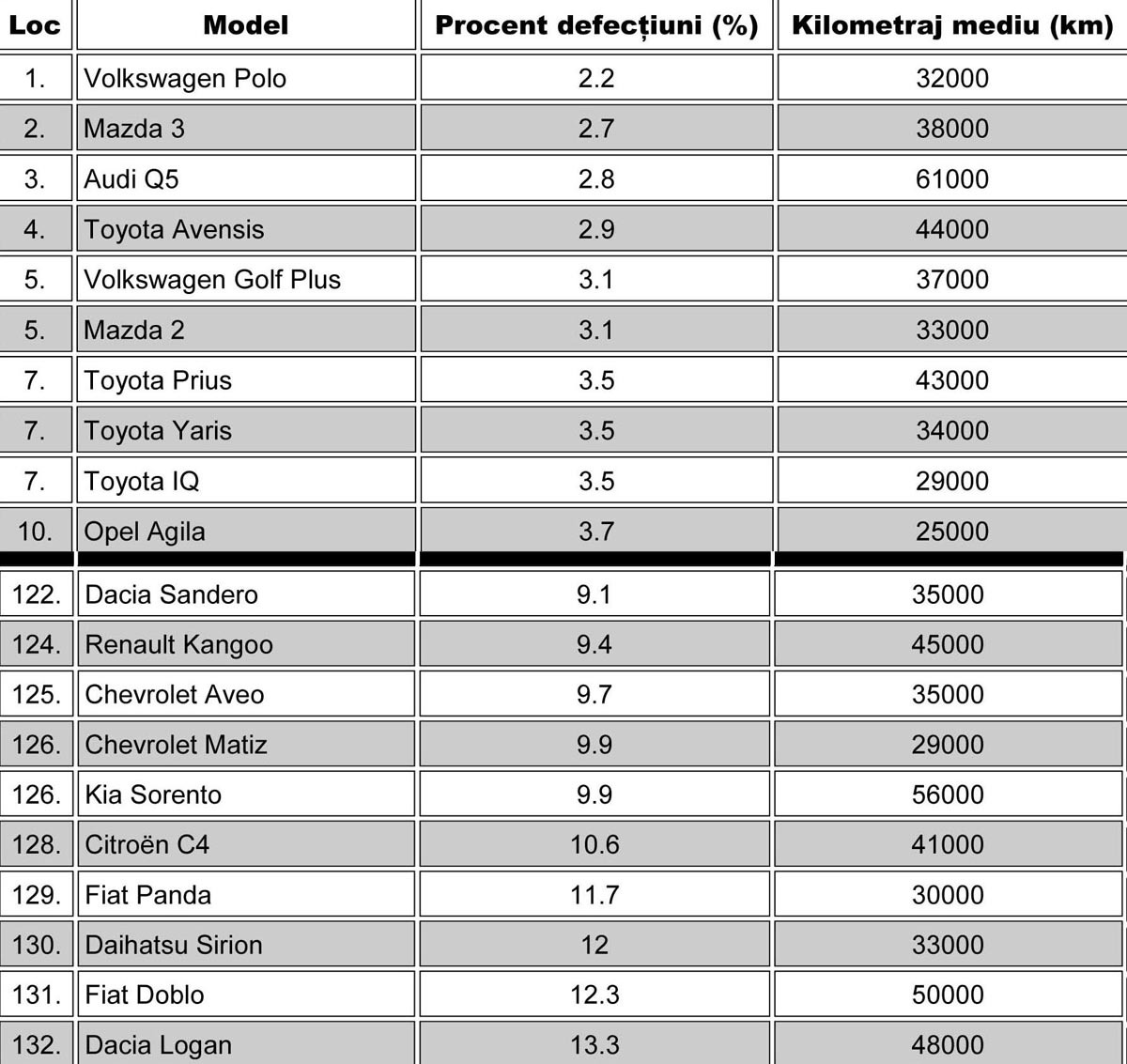 Printre ”codaşi” se numără şi modele italiene, coreene şi franţuzeşti, singurele modele ”made in Germany” din TOP 20 al modelelor cu cele mai mari procente ale defecţiunilor fiind fraţii Volkswagen Sharan şi Ford Galaxy.