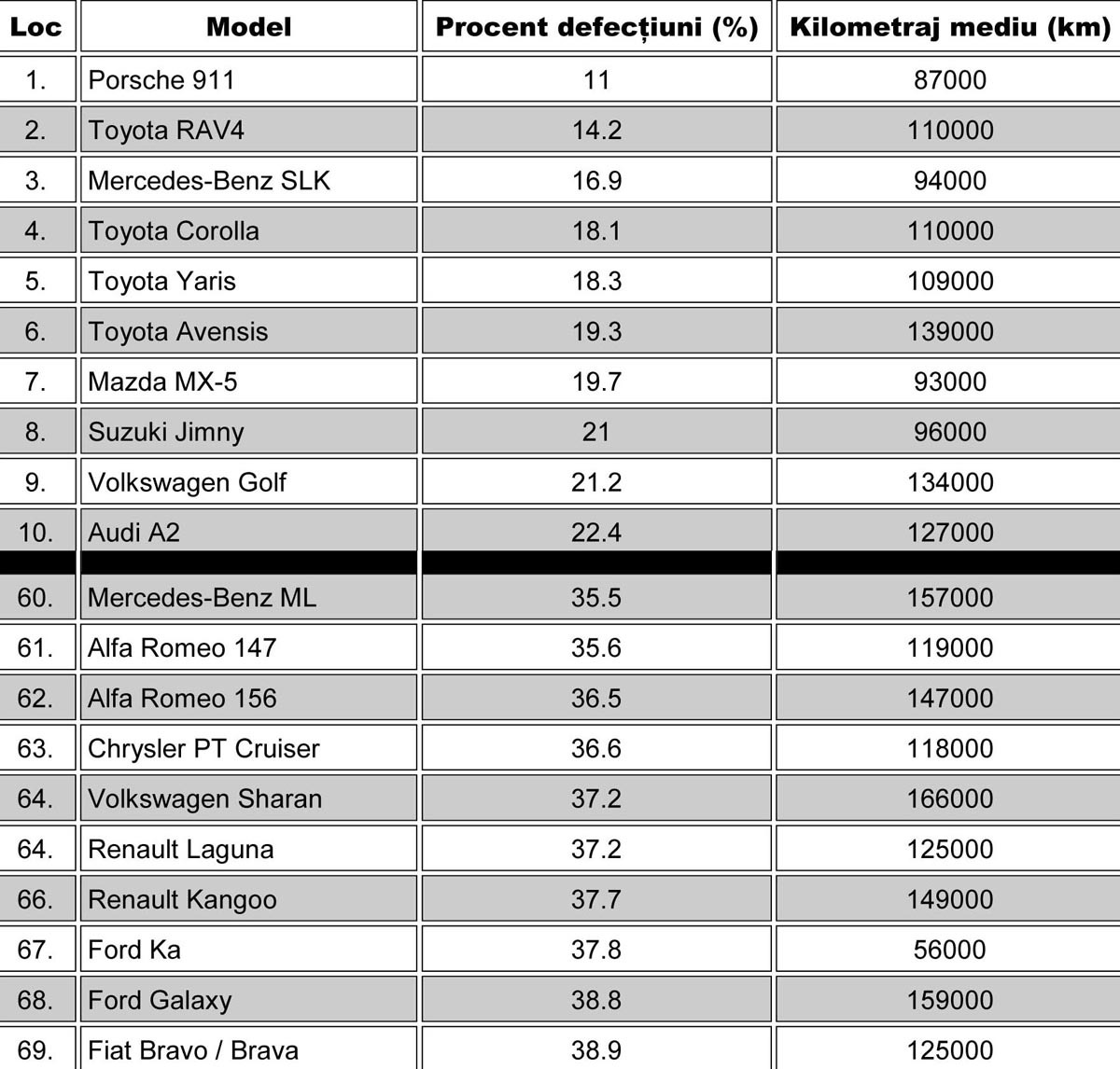 Din nou, japonezii se prezintă mai bine, 6 modele din TOP 10 fiind produse de mărci japoneze, patru dintre modele purtând sigla Toyota (RAV4, Corolla, Yaris şi Avensis). De remarcat prezenţa în acest TOP 10 a nu mai puţin de trei modele sport (911, SLK şi MX-5), dar şi a ineditului Audi A2 (pe poziţia a 10-a, cu 22,4%), monovolumul de oraş având caroserie de aluminiu.