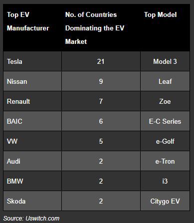 Potrivit unui clasament întocmit de serviciul Uswitch, Tesla este brandul cel mai popular de mașini electrice, fiind pe locul 1 la vânzări în 21 dintre cele 60 de țări analizate. Cel mai popular model electric este, desigur, Tesla Model 3, acesta fiind cea mai vândută mașină electrică în 19 țări.