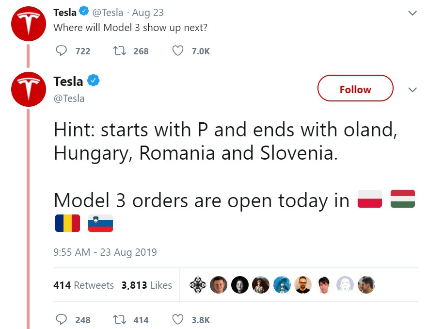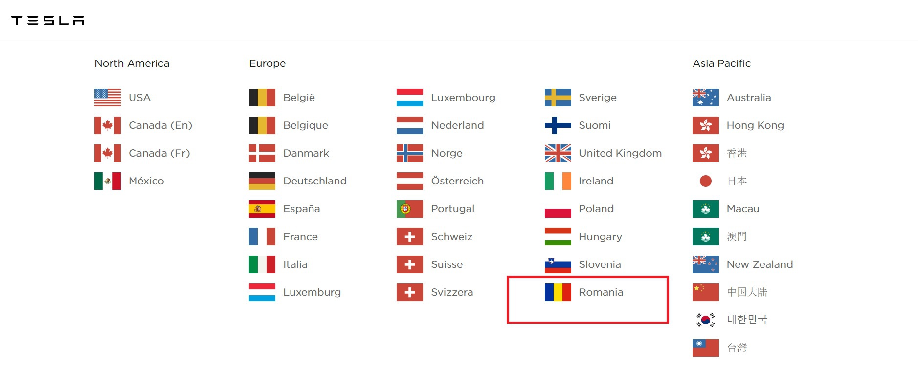 Compania americană Tesla a anunţat pe pagina de Twitter că Model 3 pot fi comandat în Polonia, România, Polonia, Ungaria şi Slovenia. Pe lângă Model 3 mai sunt disponibile şi Model S şi Model X, se arată într-o postare ulteriorară.