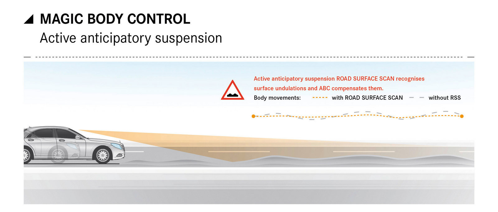 Sistemul care se ocupă de aceste modificări se numeşte Magic Body Control şi este opţional pentru modelele cu motoare în opt cilindri. În echiparea standard a acestor variante de motorizare, noul S-Class are parte de ultima generaţie a sistemului Airmatic, care ajustează automat moliciunea suspensiei în funcţiile de condiţiile de drum.