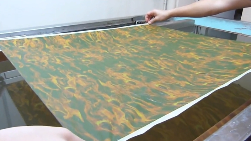 … şi se pune atent în apă. După care urmează un proces (o să-l numim „magie”) prin care culorile printului rămân pe suprafaţa lichidului. Pasul doi este scufundarea atentă a obiectului dorit (jantă, aripă, grijă, rezervor de motocicletă, probabil şi încălţăminte etc.) în lichid…
