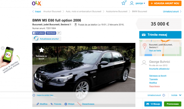 „E un moment dulce-amar. E timpul să mă despart de cea mai [….] mașină pe care am avut-o vreodată. Puneți în locul punctelor orice atribut i-ați atașa unei amante. Acest BMW M5 este pentru mine genul acela de plăcere vinovată pe care până și soția ta o îndrăgește”, scria George Buhnici în momentul vânzării (2016).