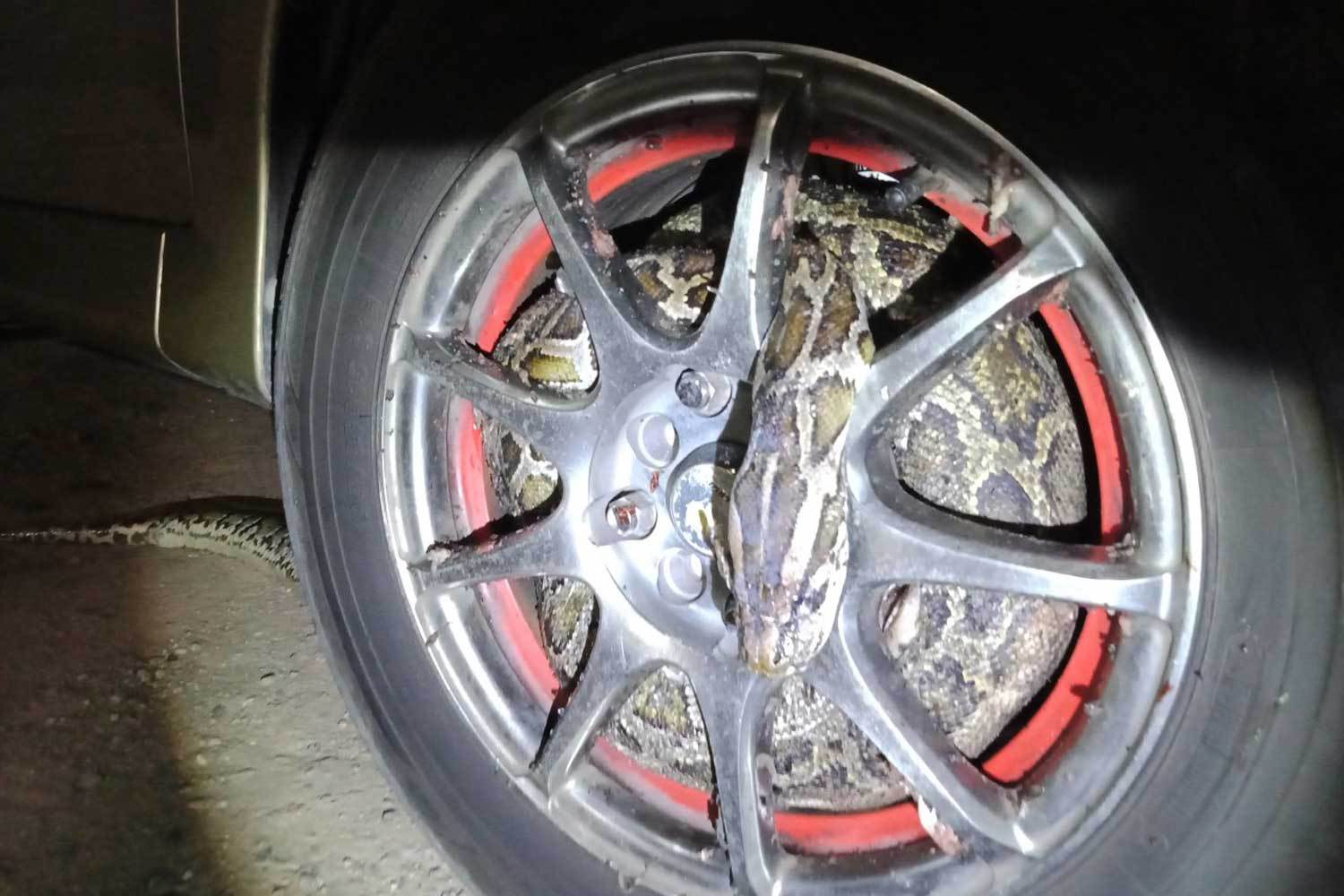Imediat după aceasta a auzit zgomote puternice venind dinspre partea din faţă a maşinii şi a oprit pentru a investiga problema. Spre marea lui surpriză, a descoperit un piton uriaş, încolăcit în interiorul roţii din dreapta faţă.