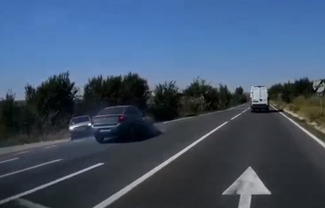 Două maşini ies din coloană. Prima încearcă să vireze la stânga, iar cea de-a doua să depăşească, ambele călcând pe linia continua. Ele se accidentează pe contrasens, una din ele ajungând în şanţ.