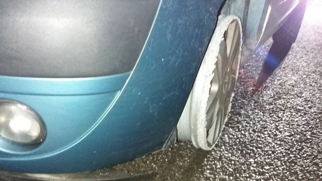 Poliția a postat pe Twitter fotografii cu mașina fără cauciucuri, precum și descrierea: „După cum se vede, e ușor să înțelegeți de ce am oprit imediat această mașină”.