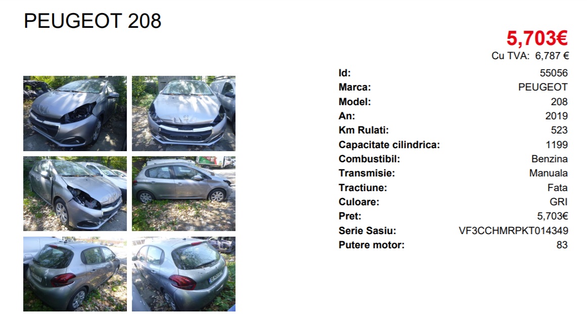 De exemplu, pe site-ul Revanzare.bcr-leasing.ro am găsit un Peugeot 208 care se află într-o stare deplorabilă având în vedere prețul cu care se vinde: 6.787 de euro (TVA inclus).