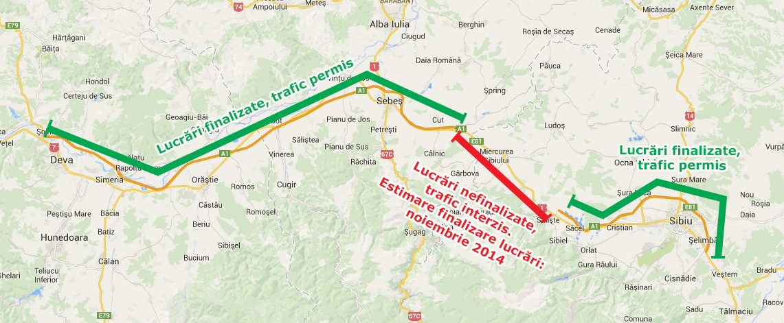 Autostrada A1 Sibiu-Orăştie ar fi trebuit să fie gata în 2013, însă câteva alunecări de teren au făcut ca lotul trei (de la Sălişte la Cunţa) să fie întârziat, în vreme ce celelalte trei loturi (1, 2 şi 4) au fost date deja în folosire în decembrie anul trecut.