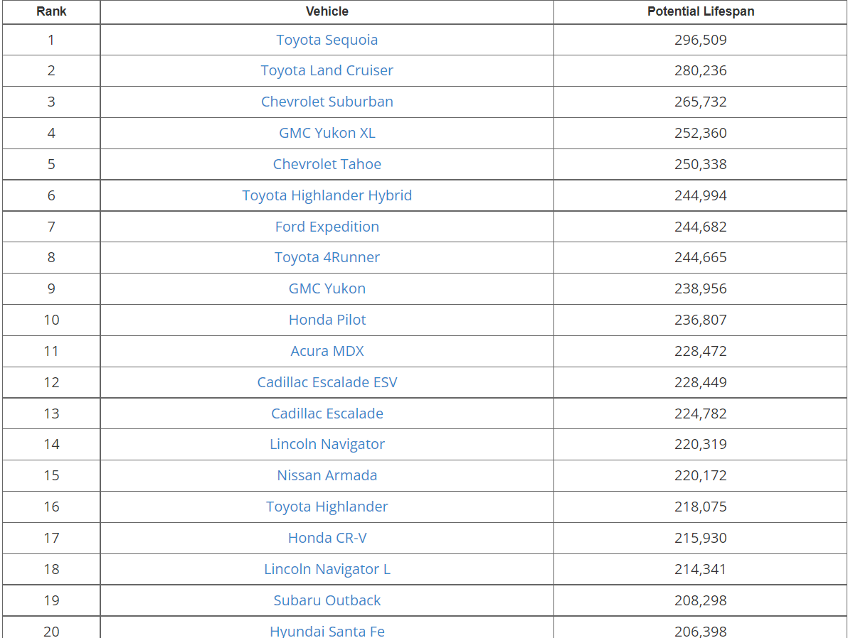 Studiul a stabilit că 1% dintre SUV-urile Toyota Sequoia au cel puțin 477.185 km, ceea ce sugerează că au fost construite pentru a rezista. Modelul a fost urmat de Toyota Land Cruiser cu 450.996 km. Pe ultima treaptă a podiumului s-a clasat Chevrolet Suburban cu 427,654 km.