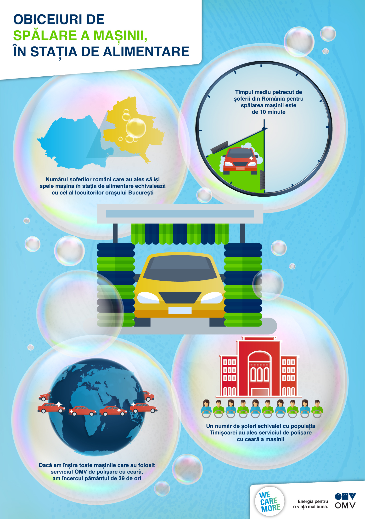 Potrivit OMV Data Center, echivalentul a 27,3% din totalul autoturismelor înregistrate în România au ajuns în staţiile OMV în decursul unui an, pentru a beneficia de unul dintre serviciile de spălare.