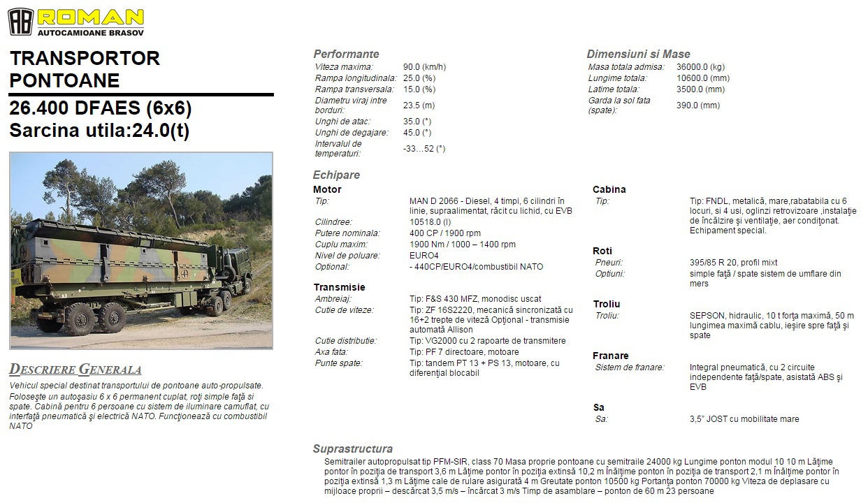 26.400 DFAES este un vehicul destinat transportului de pontoane auto‑propulsate. Foloseşte un autoşasiu 6×6 permanent cuplat, roţi simple faţă si spate. Cabină pentru 6 persoane cu sistem de iluminare camuflat, cu interfaţă pneumatică şi electrică NATO. Funcţionează cu combustibil NATO.