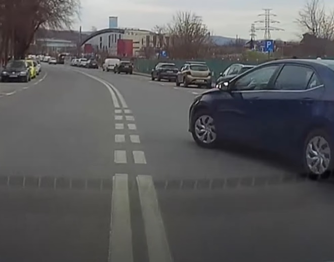 Șoferul unui autoturism a făcut viraj la stânga, într-o zonă cu linie punctată, dar fără să se asigure. Cel din spate a fost luat prin surprindere, a încercat să-l evite și a pătruns pe contrasens, încălcând linia dublă continuă. Accidentul nu a fost evitat iar cei doi s-au ciocnit pe sensul opus de circulație. Din fericire, rezultând doar pagube materiale. Cine e vinovat de acest accident?