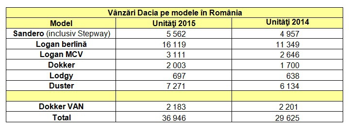 ”Codaşele” în topul vânzărilor au fost reprezentate de modelele Lodgy şi Dokker, acestea au înregistrat 697 de unităţi vândute în 2015, cu 59 mai multe maşini faţă de 2014. Creşterea a fost susţinută în bună măsură de succesul noilor versiuni Stepway.