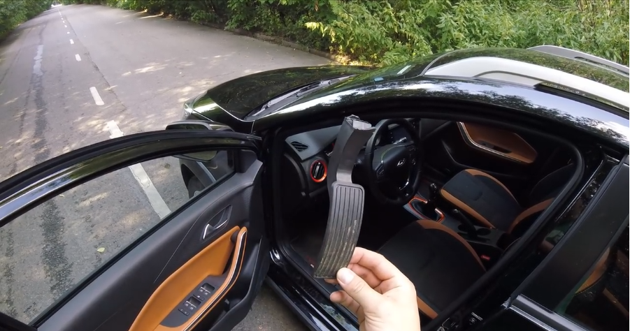 Omul se apleacă apoi sub tabloul de bord şi scoate de acolo o pedală subţire, din plastic.