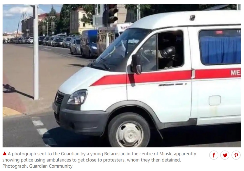 Theguardian.com a publicat o imagine cu o ambulanță despre care martorii spun că înăuntrul ei s-ar afla polițiști pregătiți să aresteze protestatari. Polițiștii se foloseau de ea pentru a se apropia de protestatari.