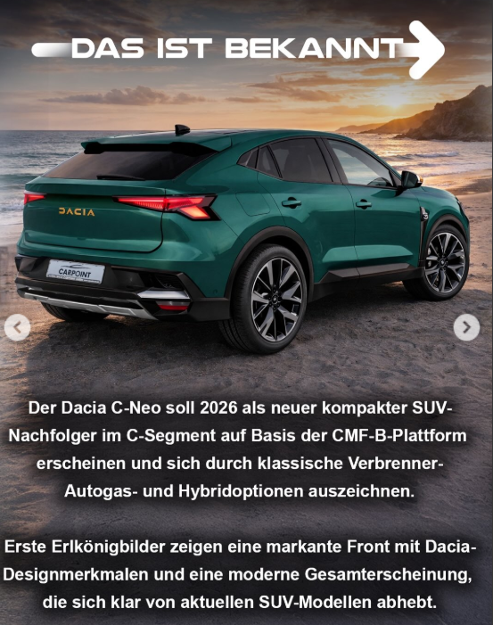 Deși denumirea C-Neo este intens vehiculată, inclusiv în materialele Carpoint, există tot mai multe indicii că prototipul surprins recent în teste pe drumurile din Alpi nu va ajunge pe piață sub acest nume. Fotografii cu un model Dacia camuflat, cu o siluetă de crossover alungit și proporții de segment C, au alimentat speculațiile privind un succesor indirect pentru Logan, însă surse din industrie sugerează că producătorul ar putea opta pentru o denumire complet diferită.