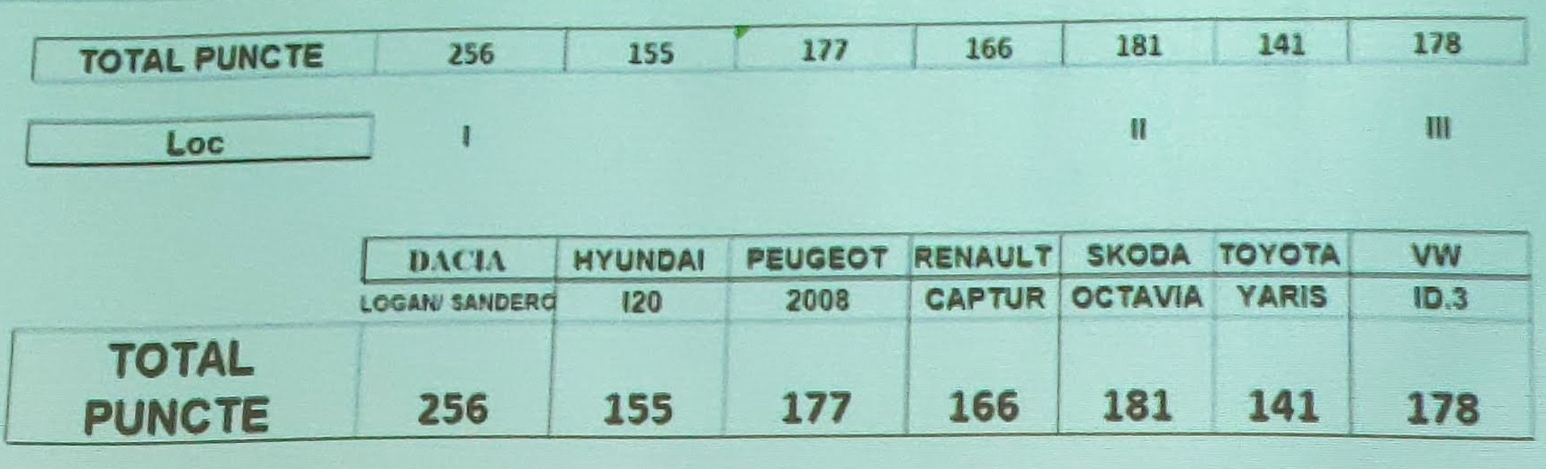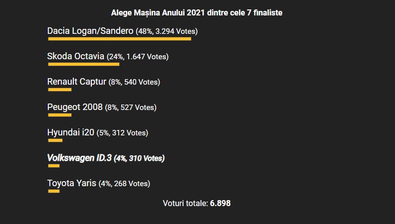 Punctajul final a reconfirmat poziția Skodei Octavia de lider al pieței de import. De asemenea, primul model electric din istoria competiției Mașina Anului – Volkswagen ID.3 – a fost foarte convingător, obținând poziția a treia în clasament. Iată rezultatele și punctajele obținute de modelele calificate în finală: