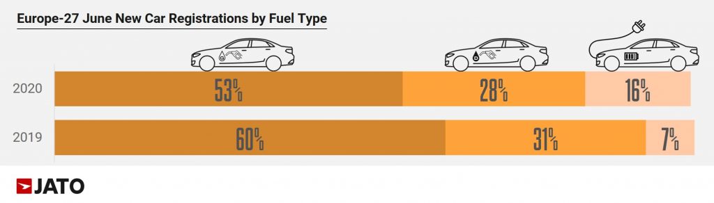 Vehiculele electrice, care au beneficiat de discounturi tot mai mari din partea guvernelor din Europa, au înregistrat creşteri semnificative în vânzări. Astfel că achiziţiile electrice, hybrid şi plug-in s-au majorat cu 16,2% , arată datele Jato. În același timp, mașinile diesel au pierdut în popularitate, ajungând la o cotă de 28% în vânzările de mașini noi în Europa.