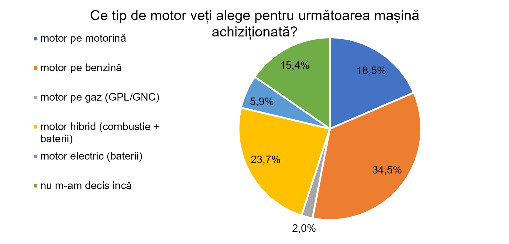 Mașinile pe benzină rămân însă în topul opțiunilor românilor, cumulând un procent de 35% al preferințelor exprimate de respondenți, iar cele diesel înregistrând o scădere și 19% din opțiuni.