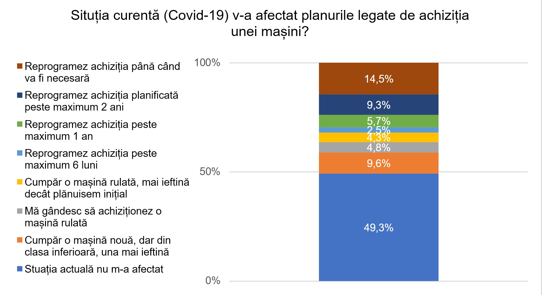 Pandemia de COVID-19 a determinat jumătate dintre șoferii români (50,7%) să își modifice planurile de achiziție a unei mașini și să aleagă o mașină mai ieftină sau să amâne achiziția. Astfel, 20% dintre cei afectați au ales să amâne cumpărarea unei mașini pentru o perioadă de 6-24 de luni sau până când achiziția va fi absolut necesară (15%). Alți 10% au optat pentru o mașina nouă, dar dintr-o clasă inferioară și mai ieftină, în timp ce 5% s-au reorientat către o mașină rulată, conform unui sondaj EY privind obiceiurile de cumpărare a autovehiculelor.