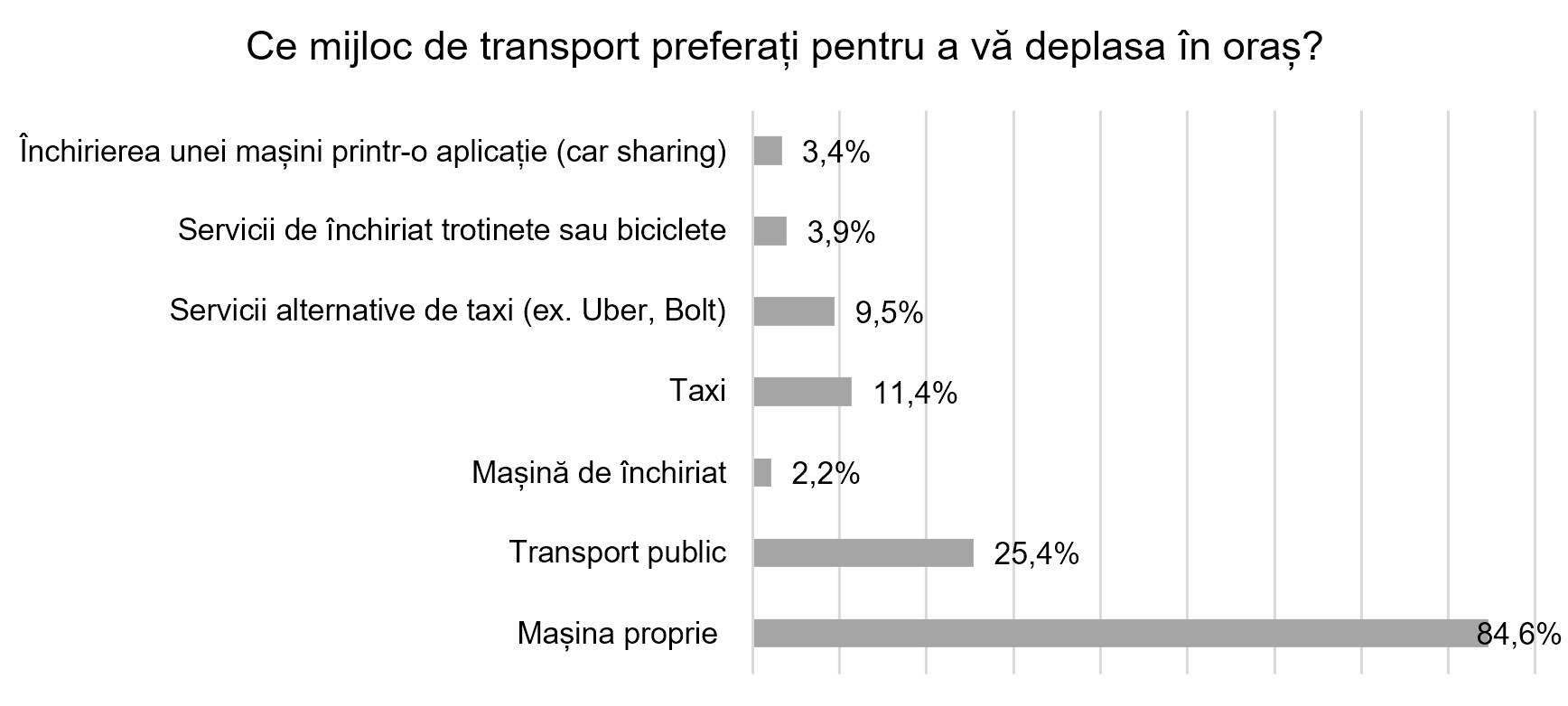 Majoritatea românilor intervievați (85%) preferă mașina personală pentru a se deplasa în interiorul orașului sau în preajma acestuia. Printre celelalte preferințe se mai numără transportul în comun și taxiul. În cazul metodelor alternative de transport (biciclete, trotinete, car sharing), cele mai importante aspecte de care țin cont sunt legate de preț și de disponibilitate acestora.