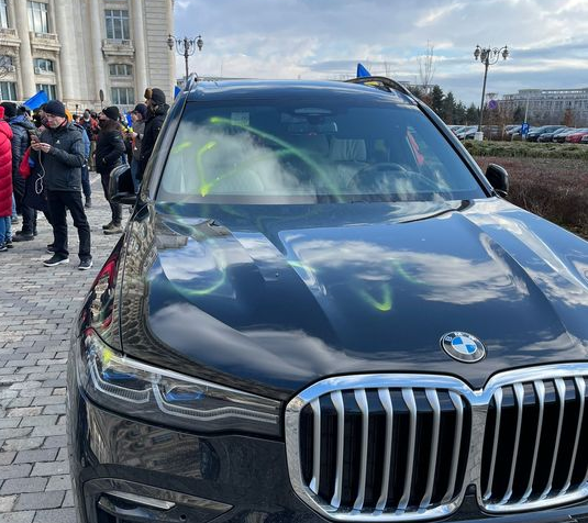 Potrivit news.ro, și un SUV de lux de la BMW a fost vandalizat și s-au scris diferite mesaje pe parbriz și pe geamurile laterale.