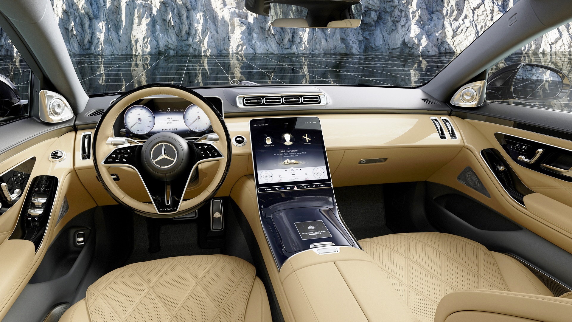 Schema de culori continuă și la interior. Planșa de bord, volanul, scaunele, panourile ușilor și plafonul sunt căptușite cu piele Nappa neagră și bej. De asemenea, și covorașele sunt bicolore, cu negru predominant și bej pe margine, și sunt brodate cu sigla Mercedes-Maybach. Același logo special Mercedes-Maybach și unul Virgil Abloh sunt emobasate pe tunelul consolei centrale, pe pernele posterioare, pe tetiere și pe praguri.