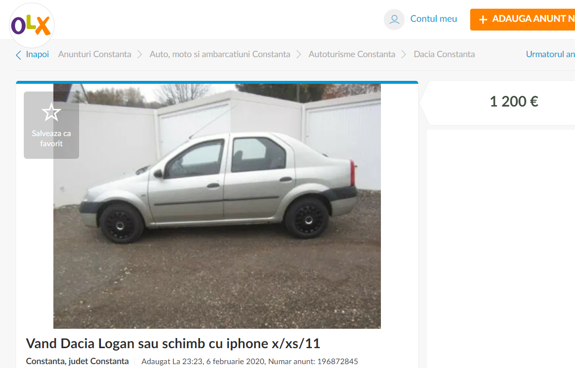 Un constănțean este gata să-și schimbe Loganul cu un smartphone, dar nu oricare. Trebuie să fie unul din modelele iPhone X, iPhone XS sau iPhone 11. Pune la schimb o Dacia Logan fabricată în 2005 cu 165.000 de kilometri la bord.