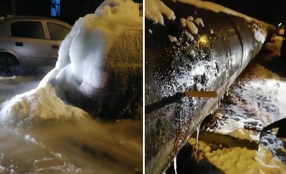 Un sibian și-a găsit mașina sub un strat gros de gheață, după ce peste noapte a apărut o avarie la o conductă și apa a țâșnit peste parcare.
