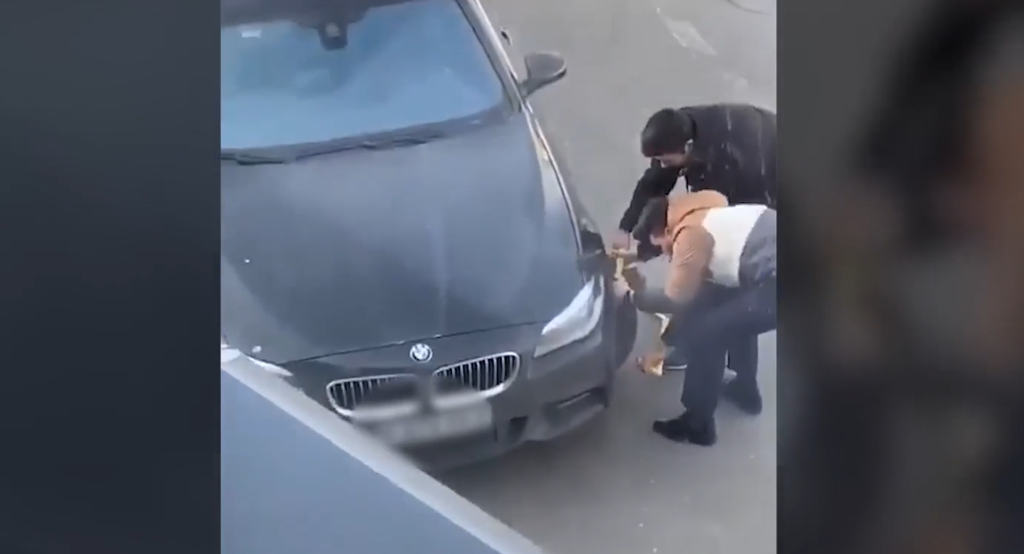 Clipul a fost postat pe Facebook, iar în el se vedem cum doi tineri încearcă să scoată acel dispozitiv de pe roata unui BMW. În timp ce aceștia trag de el, în spatele lor apare o mașină care aparține unei firme de pază, din care coboară un agent de pază și un agent de la Poliția Locală.