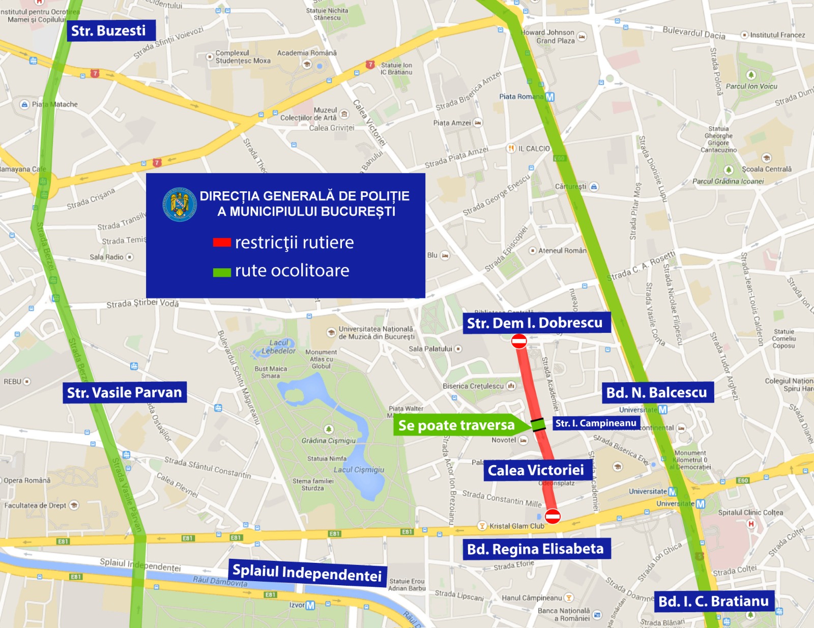 Pentru perioada 15 – 16 octombrie, traficul se va restricționa pe Calea Victoriei, segmentul cuprins între Piața Victoriei până la intersecția cu Splaiul Independenței, fără afectarea intersecției, între orele 11.00 – 00.00.