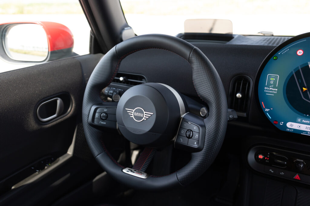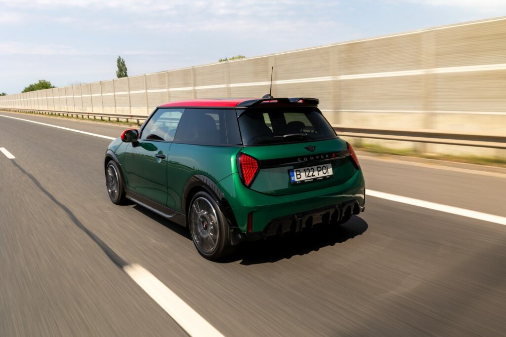 Sistemul de frânare mai performant, care vine ca parte a pachetului John Cooper Works, te ajută să oprești eficient. Pedala de frână este bine calibrată, ușor de dozat. Pe de altă parte, direcția, cu toate că rapidă și responsivă, mi s-a părut puțin cam vagă. Poate că un set de anvelope diferit ar fi îmbunățit situația.