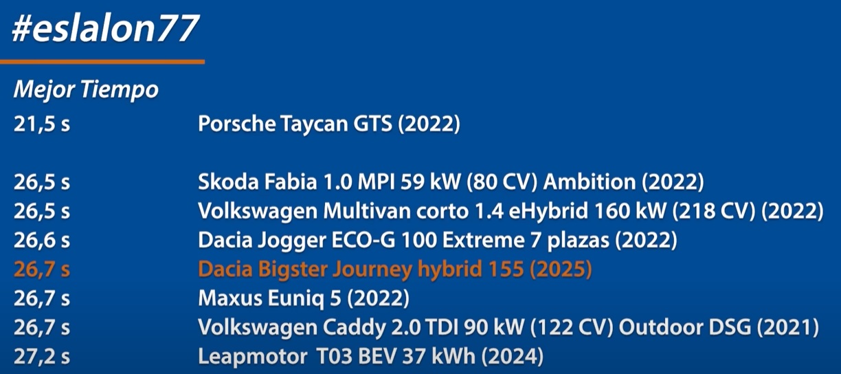 Dacia Bigster a surprins în mod plăcut în testul de slalom, unde a reușit să obțină locul 5 în topul general realizat de KM77. Clasamentul este condus de Porsche Taycan, urmat de Skoda Fabia, Volkswagen Multivan și Dacia Jogger, modelul Bigster devansând mai mulți concurenți din segmente superioare.