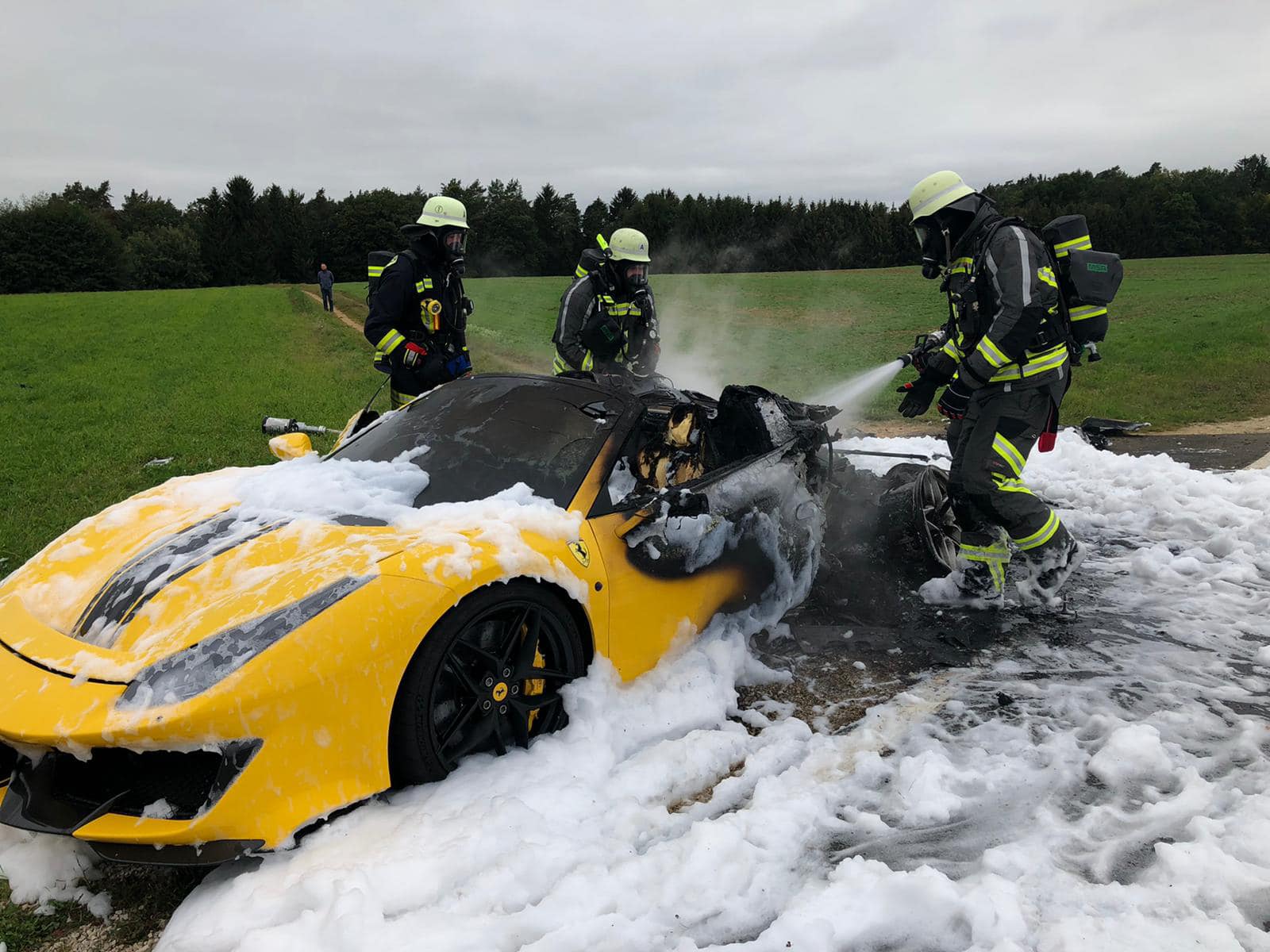 Pompierii au fost trimiși la fața locului dar Ferrari-ul galben a fost înghițit de flăcări până la sosirea lor. Purtând echipament de protecție pompierii au folosit spumă pentru stingerea flăcărilor.