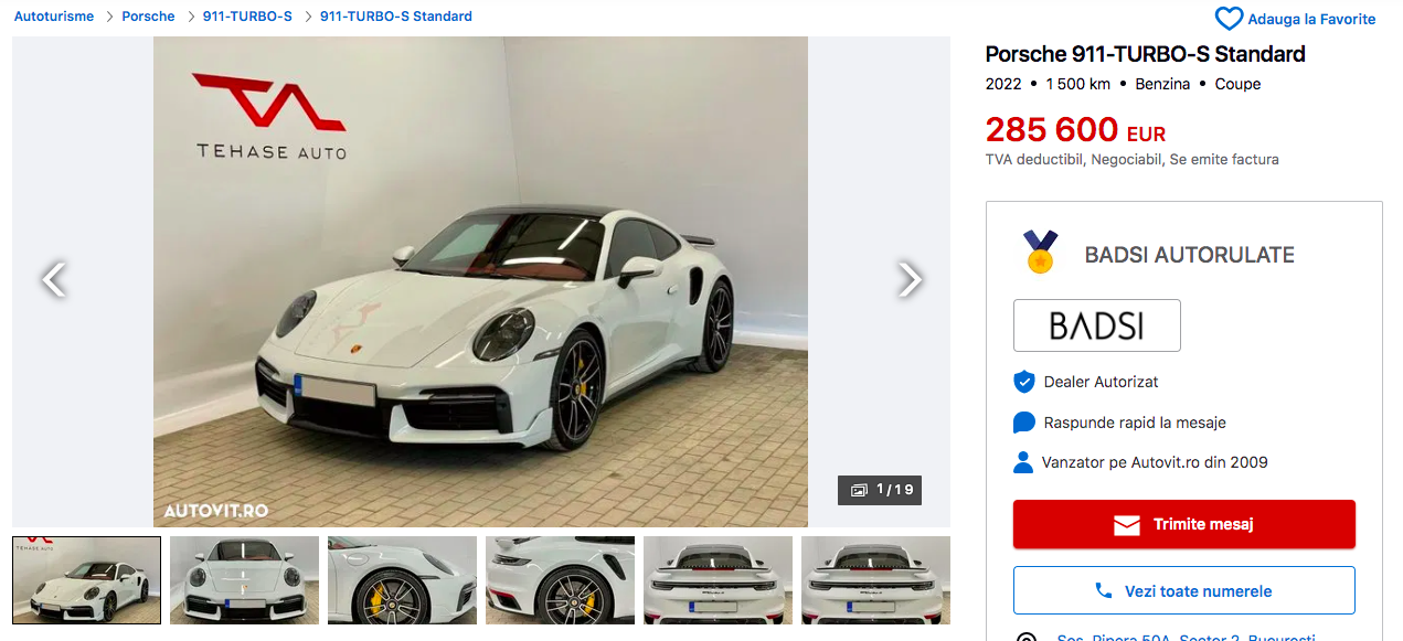Când te gândești la achiziționarea unei mașini la mâna a doua de pe o platformă specializată te duci cu gândul, cel mai probabil, la o mașină destul de ieftină. Ei bine, nu este și cazul modelului despre care discutăm în materialul de față. Pe platforma Autovit a apărut în această săptămână un model Porsche 911 Turbo S de toată frumusețea. Mașina se află într-o stare impecabilă, iar prețul este unul pe măsură.