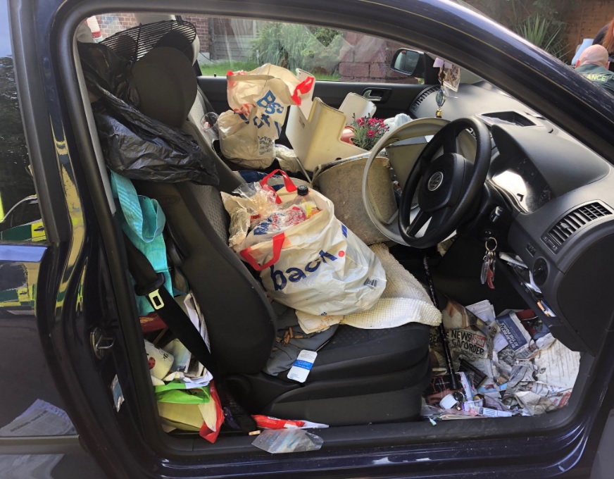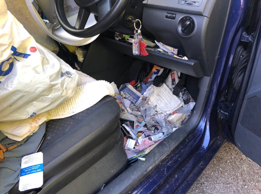 După cum se poate vedea în imagini, această Toyota Previa este plină cu tot felul de gunoaie. De la peturi şi pungi de cumpăraturi, la plante şi chiar obiecte de îmbrăcăminte. Există gunoaie chiar şi sub pedale, poate cel mai sensibil loc din maşină. Odată intrate obiecte sub pedala de frână există posibilitatea de a provoca un accident şi mai grav decât cel de faţă.