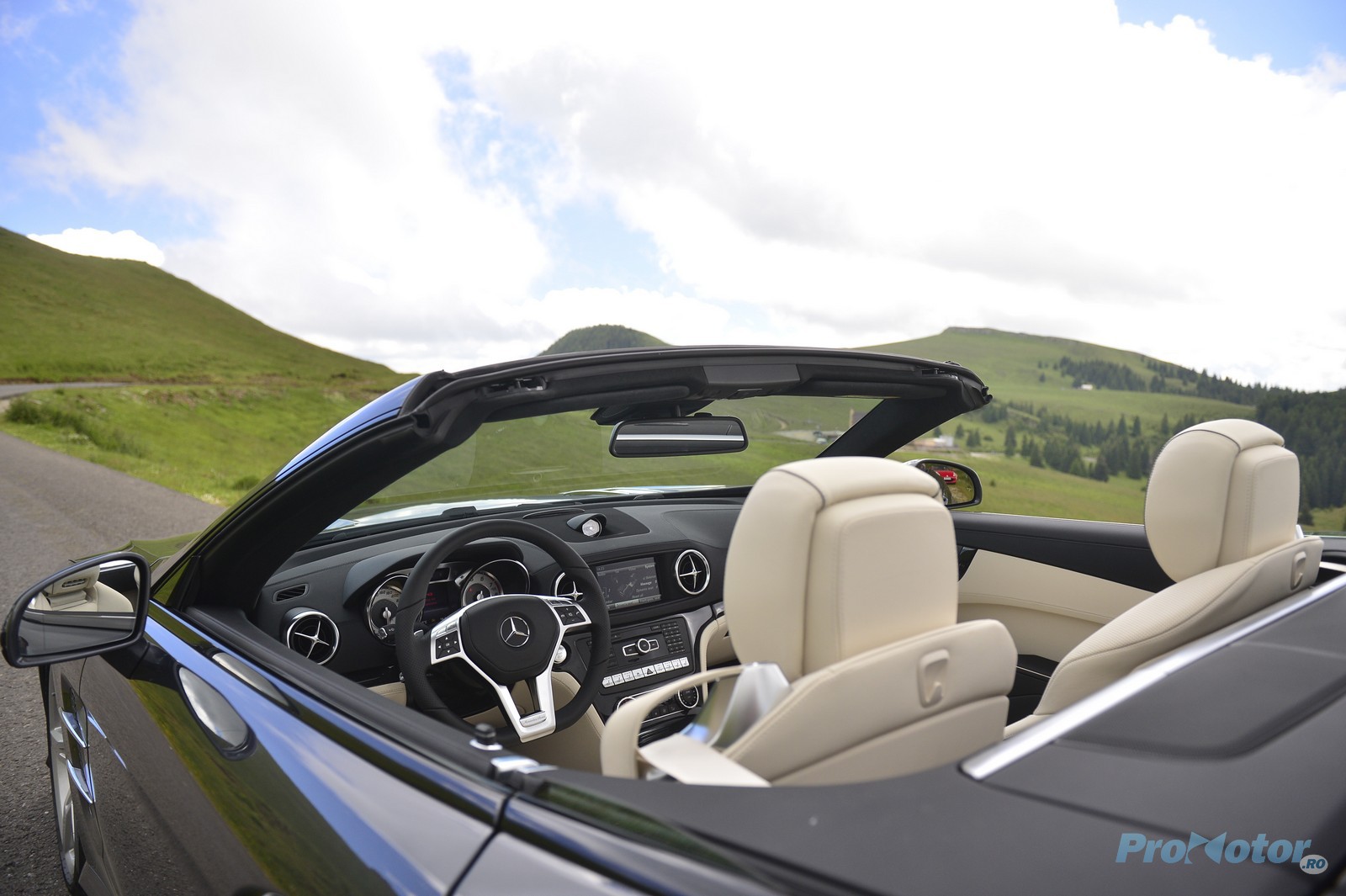 Poate că ar trebui să vorbim şi de practicitate, pentru a acoperi în mod profesionist toate aspectele unui test. Însă n-am s-o fac. Oricât de mult ar folosi Mercedes-Benz denumiri care au în componenţă cuvântul „magic”, nu vor putea să facă un plafon rigid să dispară ca prin magie. Volumul portbagajului scade de la 356 la 235 de litri atunci când plafonul este coborât, iar spaţiile de depozitare se înscriu în categoria „esenţiale”, adică nu primeşti mai mult decât ai avea nevoie într-o maşină de duminică. Este un roadster, aşa că trebuie văzut ca atare.