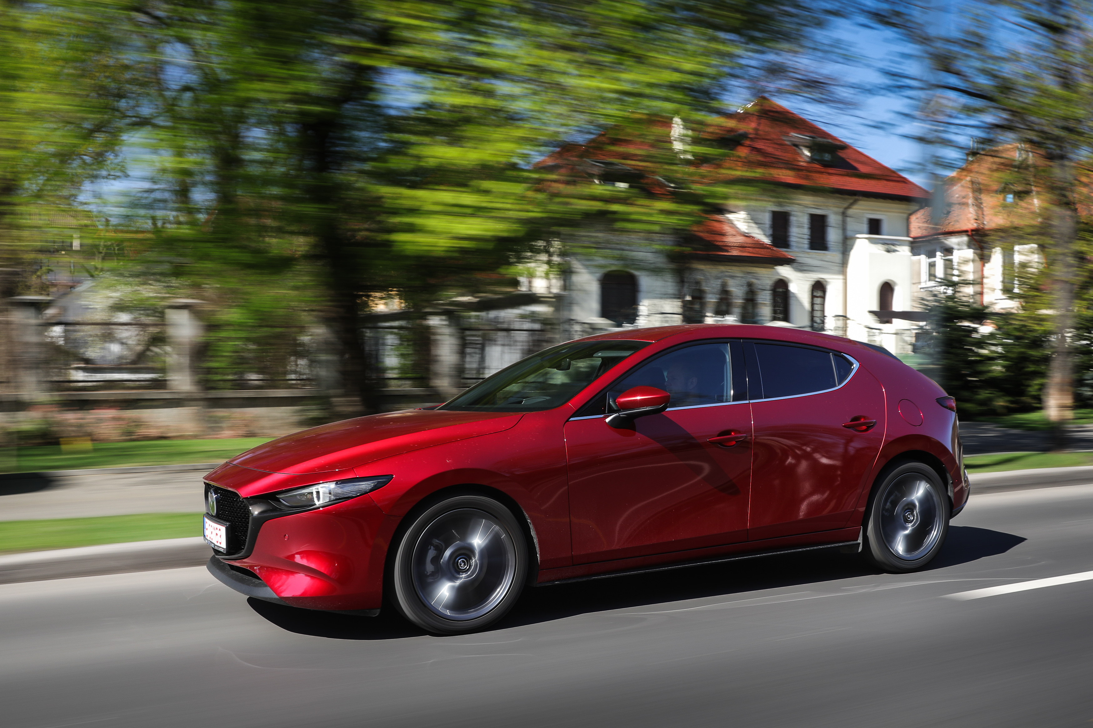 Elementele de plastic negru lucios arată mai bine decât cele cromate, în special alături de faimoasa culoare Roşu Soul Crystal. Pragurile sunt atipice, proeminente şi aşezate orizontal. Arată foarte bine, însă adună rapid praful de pe drum. Jantele din aliaj pe 16 inchi vin şi ele standard, însă pentru un look de impact ar fi nevoie de jante mai mari, precum cele aflate pe modelul nostru de test. De remarcat şi noua cheie Mazda, mult mai elegantă decât înainte.