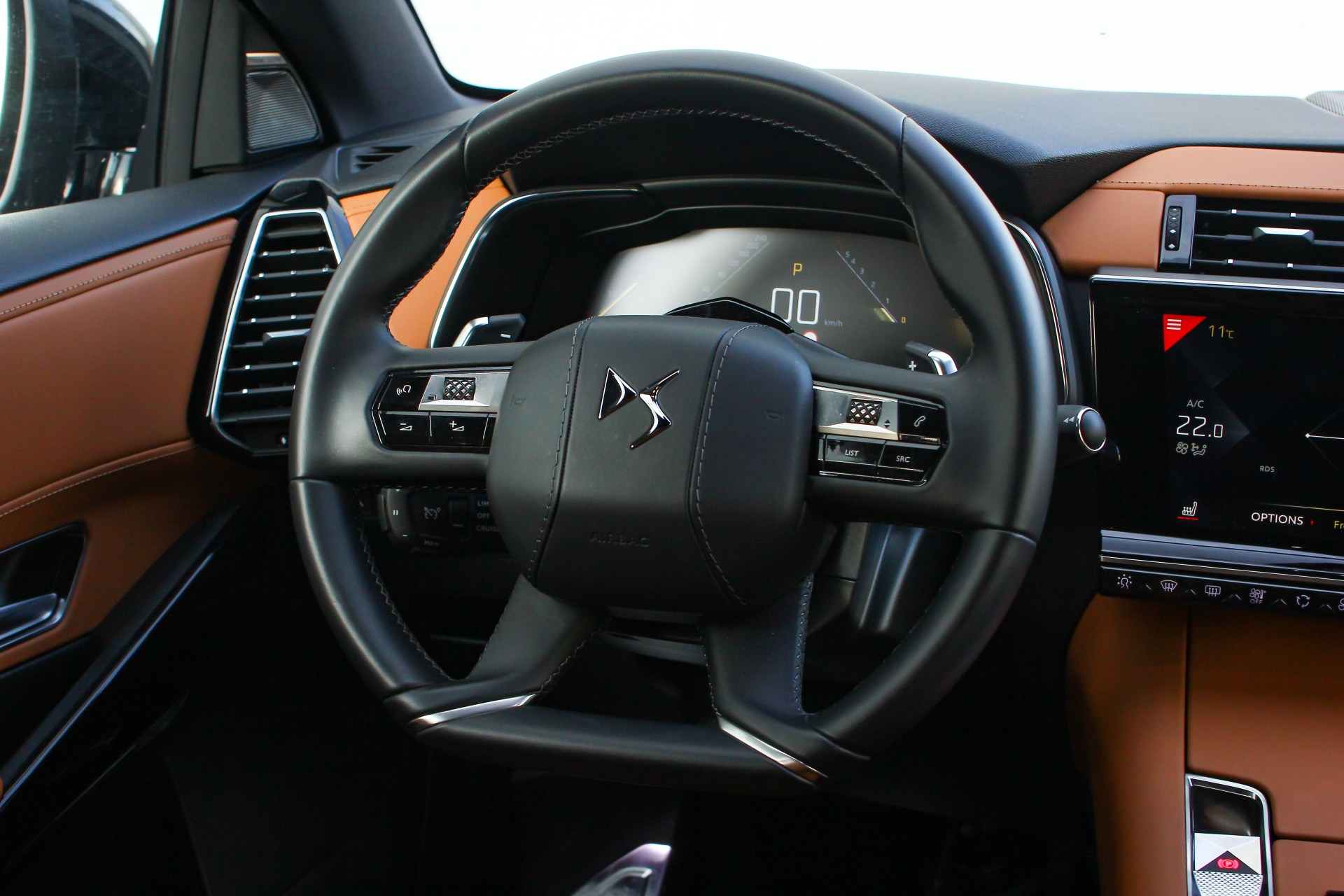 Ceasul rotativ de pe bord sau anumite butoane evocă lumea luxului, fără a lăsa vreo urmă de modestie. Ecranul central tactil este suficient de mare, are un răspuns decent la comenzi, însă grafica și ușurința cu care navighezi prin meniuri nu se ridică la nivelul oferit de cel al rivalilor de la BMW, să zicem. În habitaclu pielea maro, de calitate, se află peste tot, iar ergonomia necesită un pic de adaptare dacă te afli pentru prima dată la volanul unui DS7 Crossback.