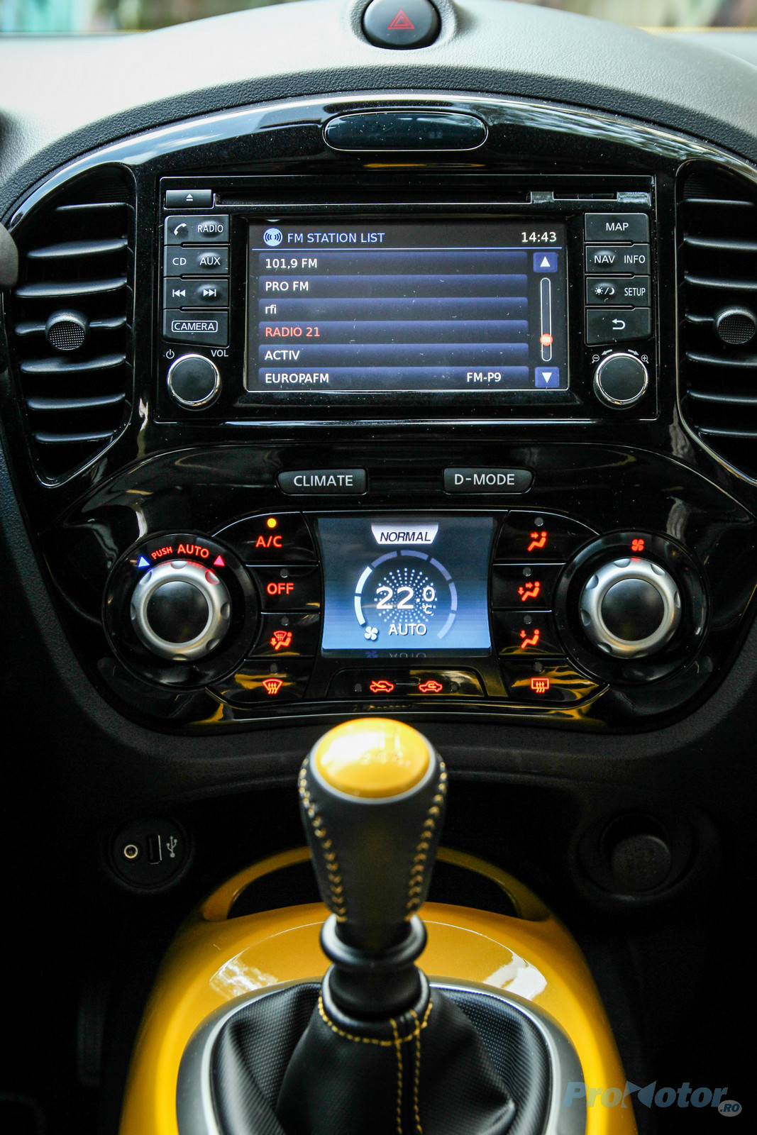 Totodată, Juke nu e o maşină extraordinar de scumpă (preţurile încep 15.490 de euro), aşa că ar trebui să te aştepţi ca plasticele folosite înăuntru să nu fie chiar premium. Şi nu sunt, dar nici nu o să te gândeşti cu groază că iar trebuie să intri într-o conservă pe patru roţi. Materialele sunt tari, dar arată bine şi există câteva opţiuni de personalizare care îndulcesc şi mai mult habitaclul. De exemplu, maşina de test avea câteva elemente vopsite în acelaşi galben ca exteriorul, iar volanul şi schimbătorul de viteze erau îmbrăcate în piele.