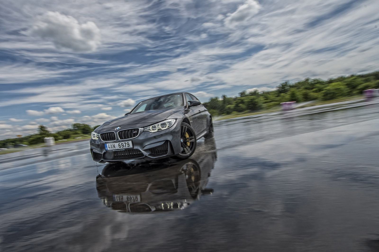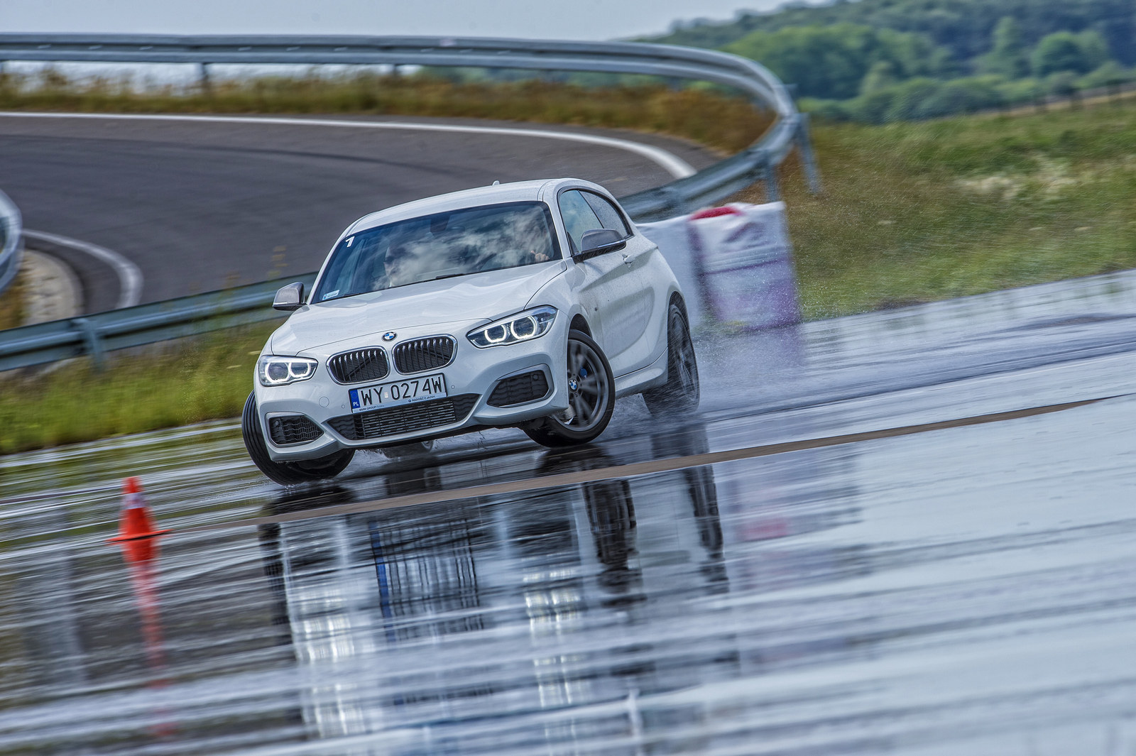 Instructorul ne-a dus în zona în care urma să facem drifturi controlate pe o suprafaţă umedă în formă de cerc. Zis şi făcut. Prima dată cu M3-ul, iar apoi cu un M135i, câte cinci minute cu fiecare – suficient ca să te bucuri de putere, dar prea puţin ca să te înveţi cu animalul care abia aşteaptă să îşi arate colţii dacă îl calci pe coadă.