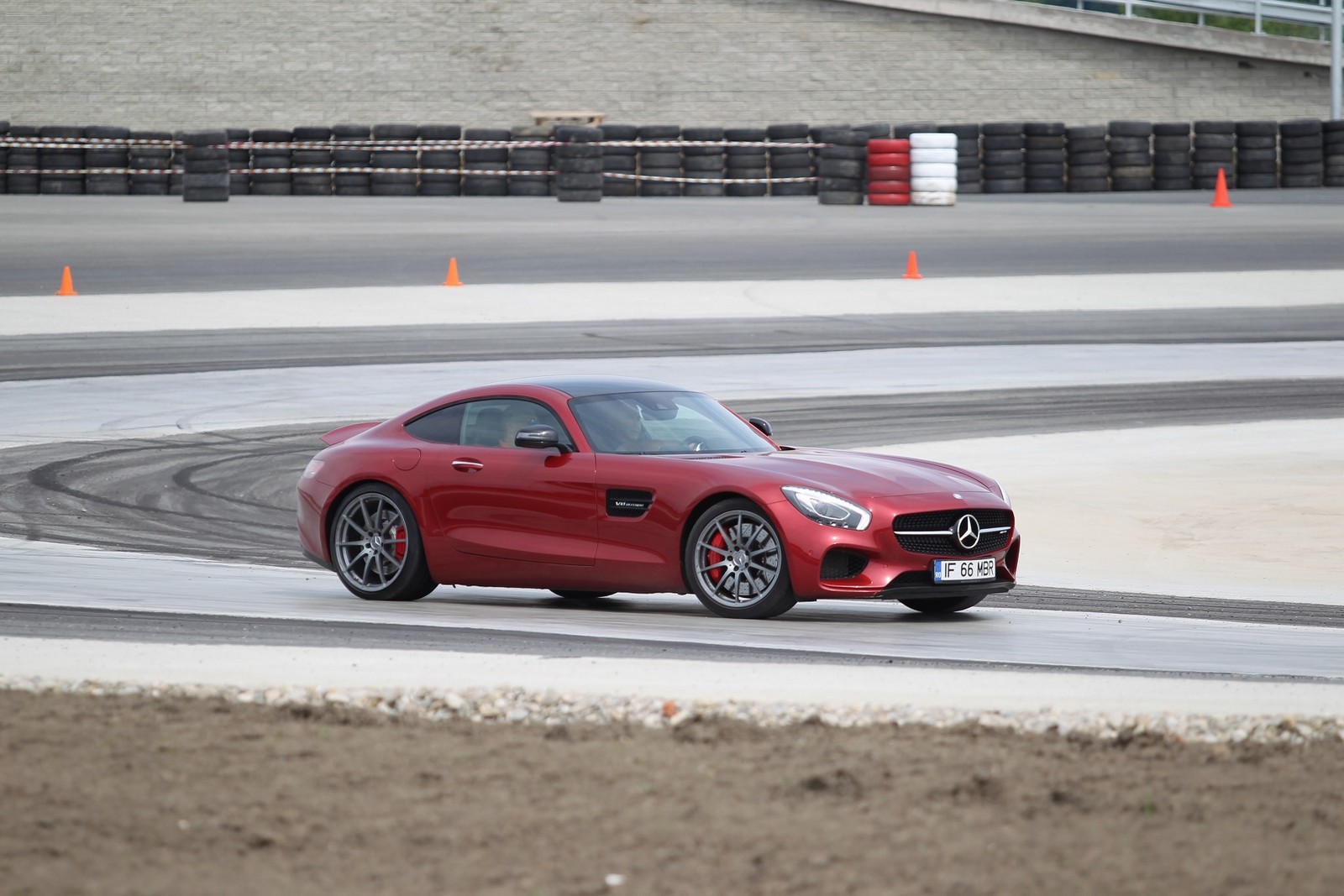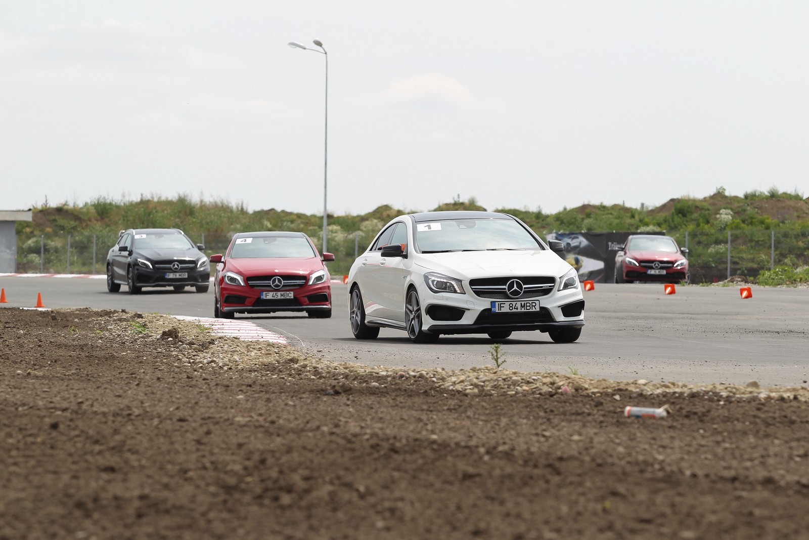 Pentru circuit, Mercedes a scos gama de compacte – A 45 AMG, CLA 45 AMG, GLA 45 AMG – unde puteai, urmând traseul tehnic, să-ţi dai seama în care dintre ele cei 360 de cai-putere îţi plac mai mult. În cazul meu, a fost CLA-ul, al cărui spate plonjat tinde să iasă în afară în viraje, iar tu nu poţi decât să te bucuri de asta, în timp ce-ţi pui toată încrederea în sistemul 4MATIC şi te bucuri că există şi că nu lasă spatele să ajungă înaintea feţei.